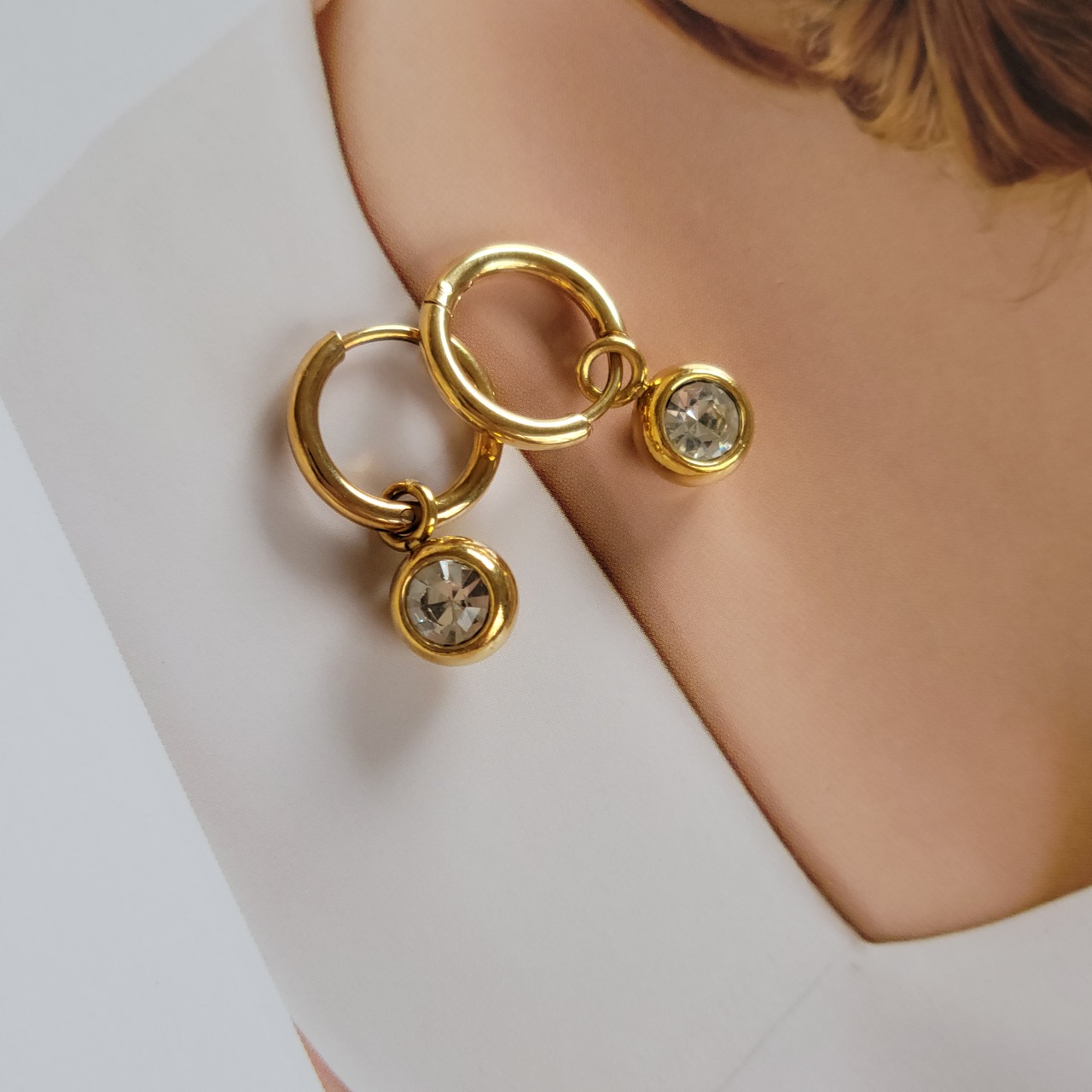 フープから一粒ストーンが揺れるたびに、光を受けて輝き、耳元に視線を惹きつけます。