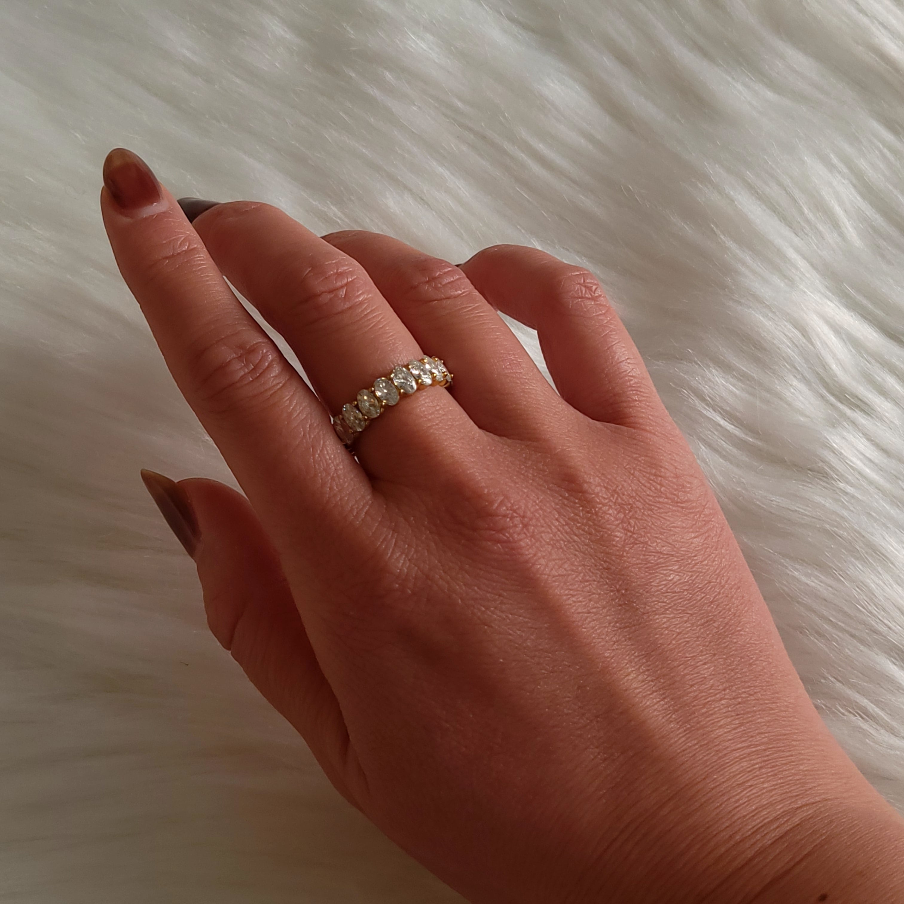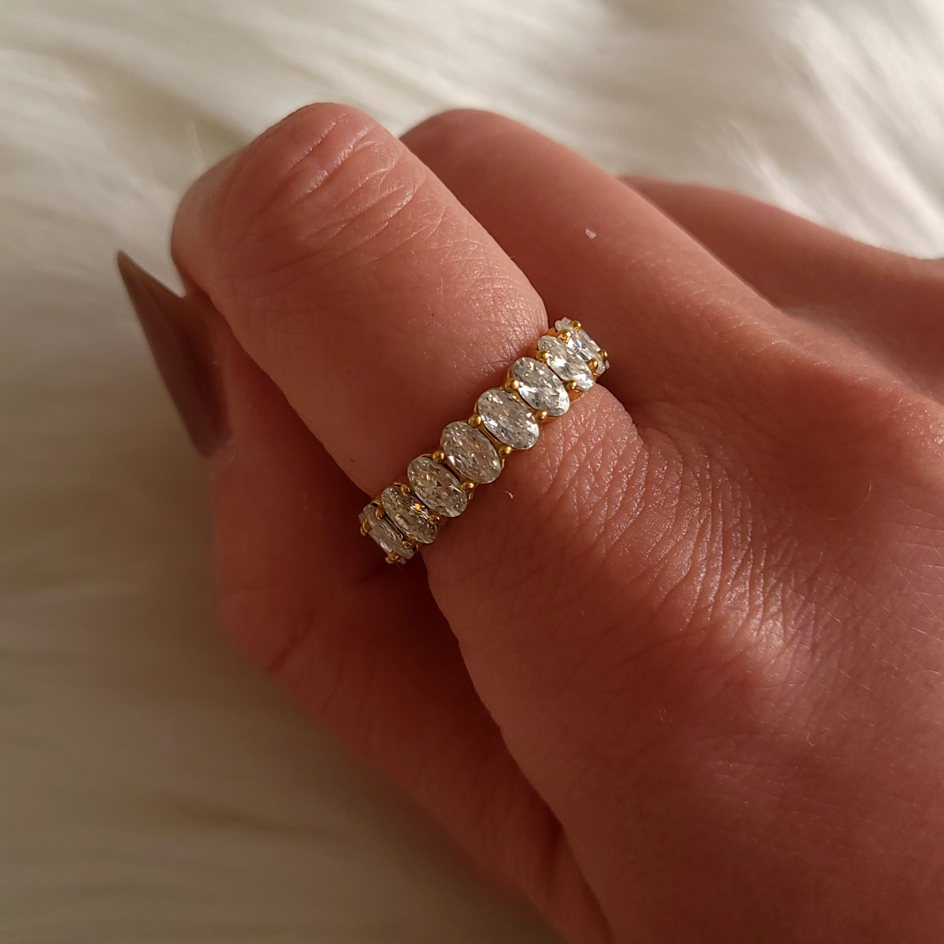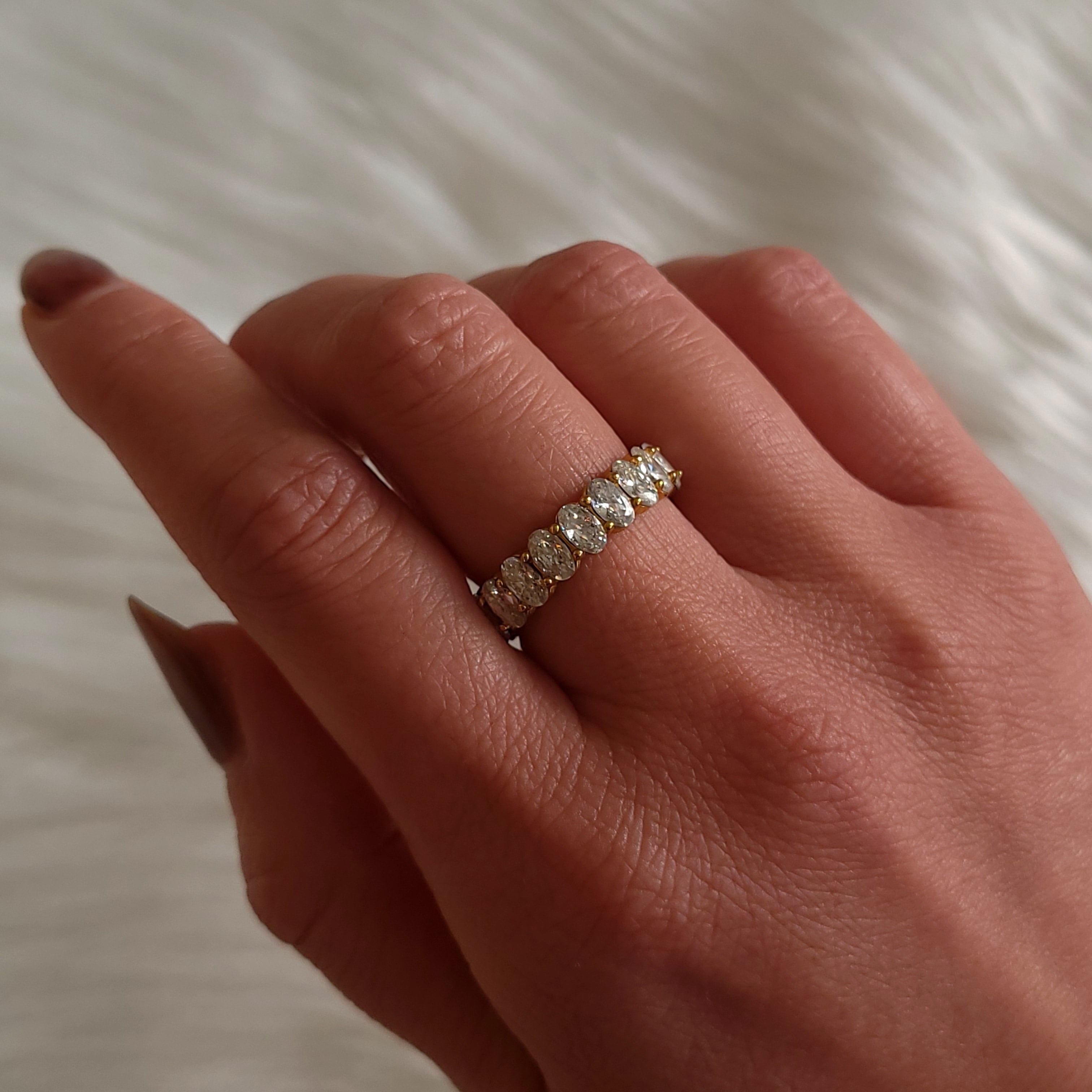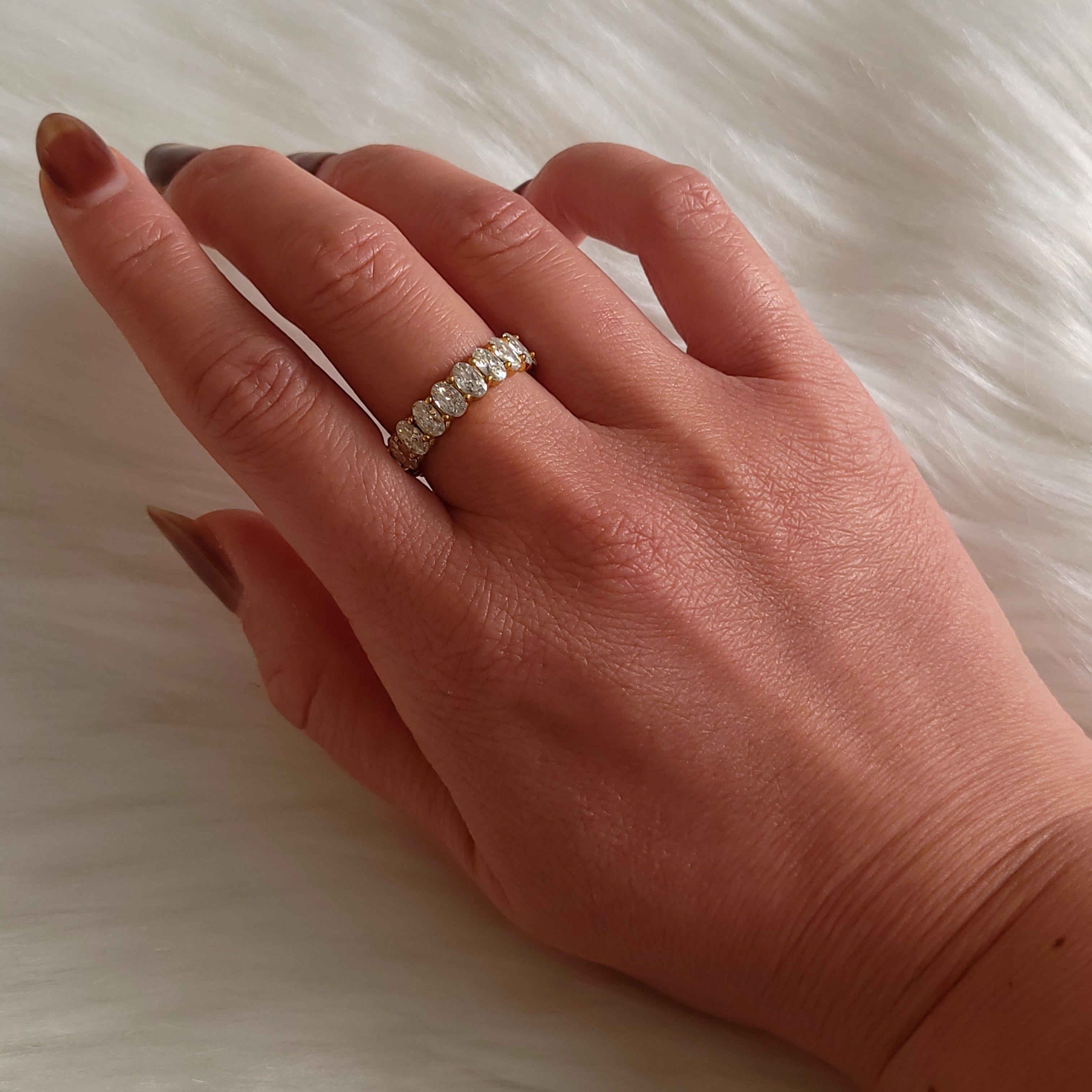 指先に静かな輝きのリズムを刻むエタニティリング。