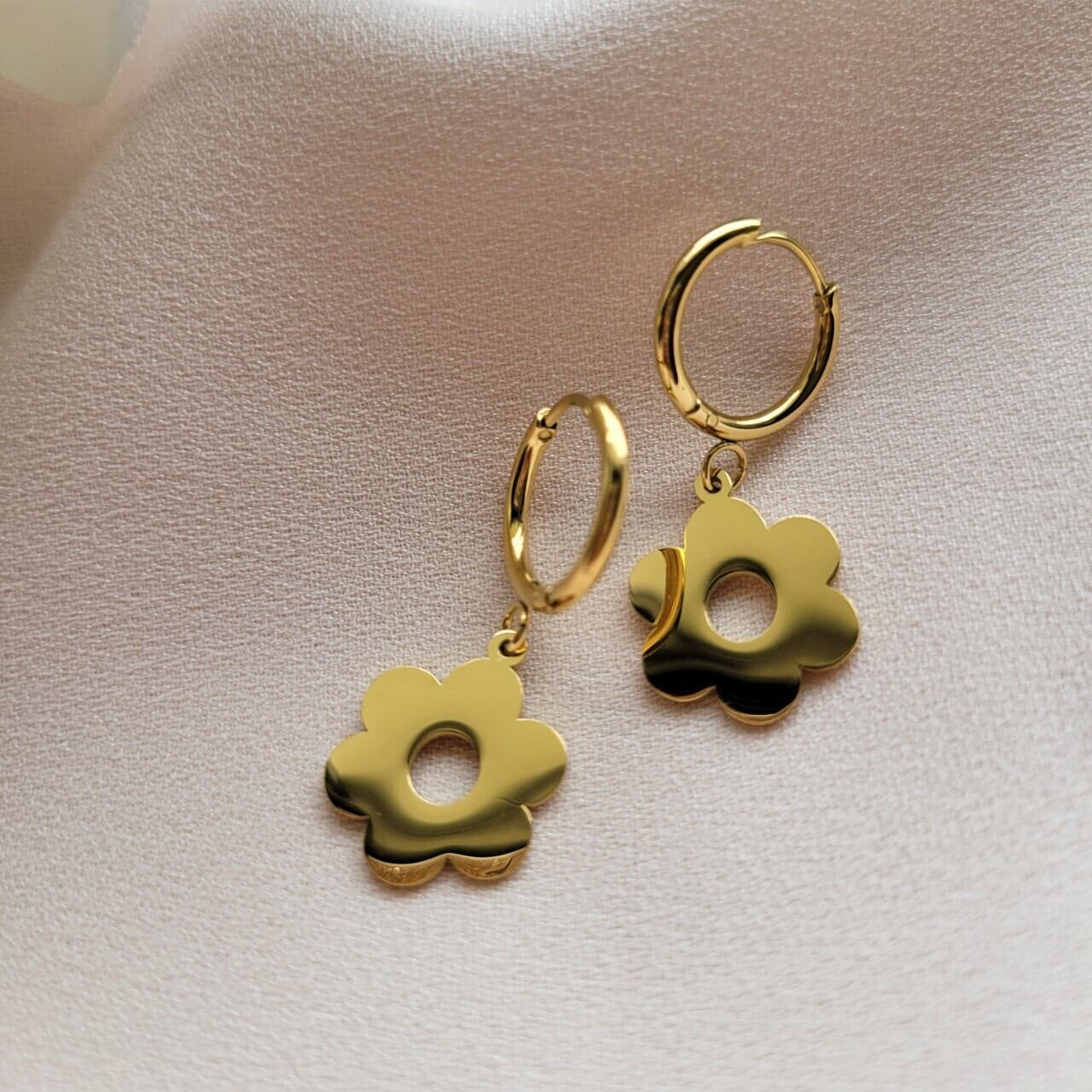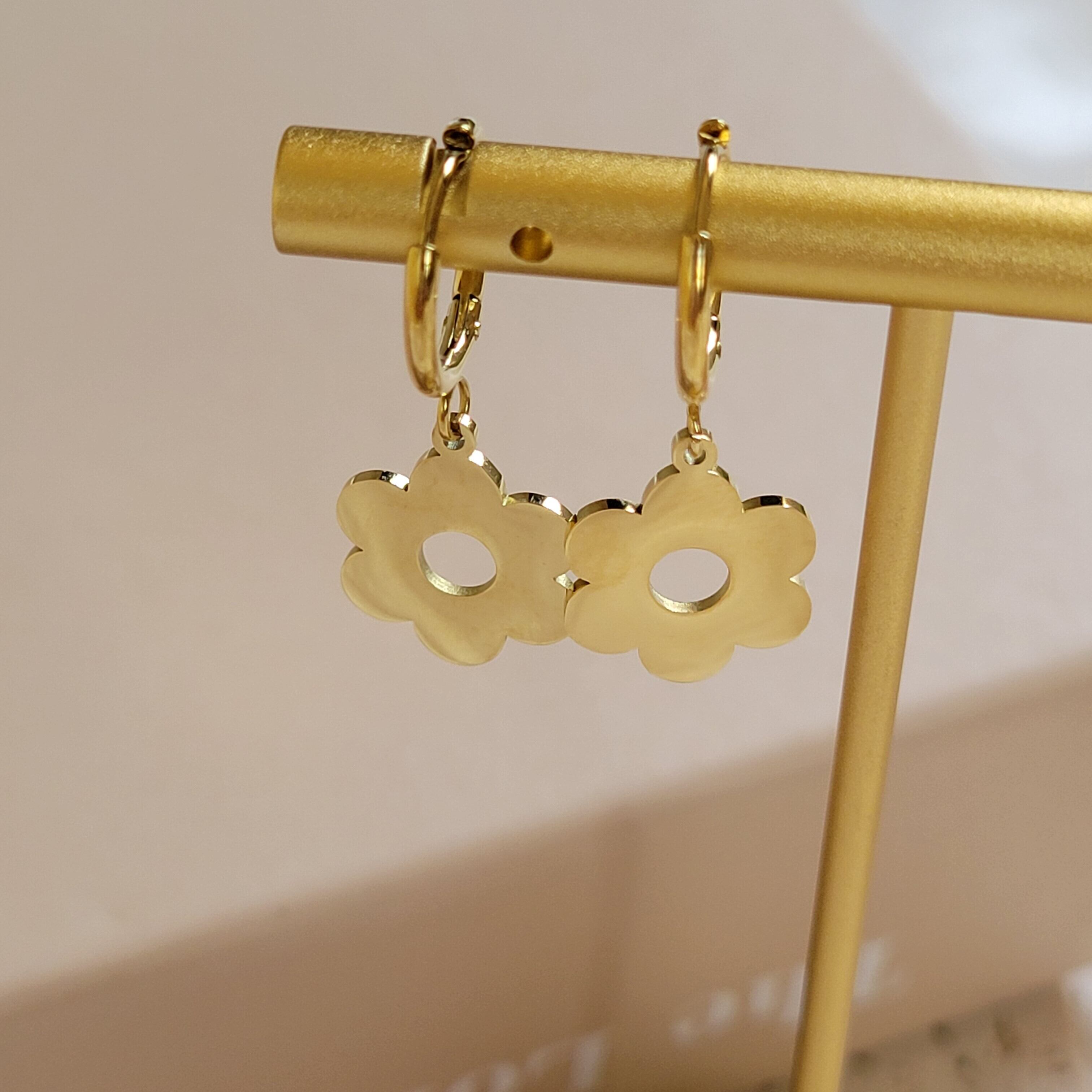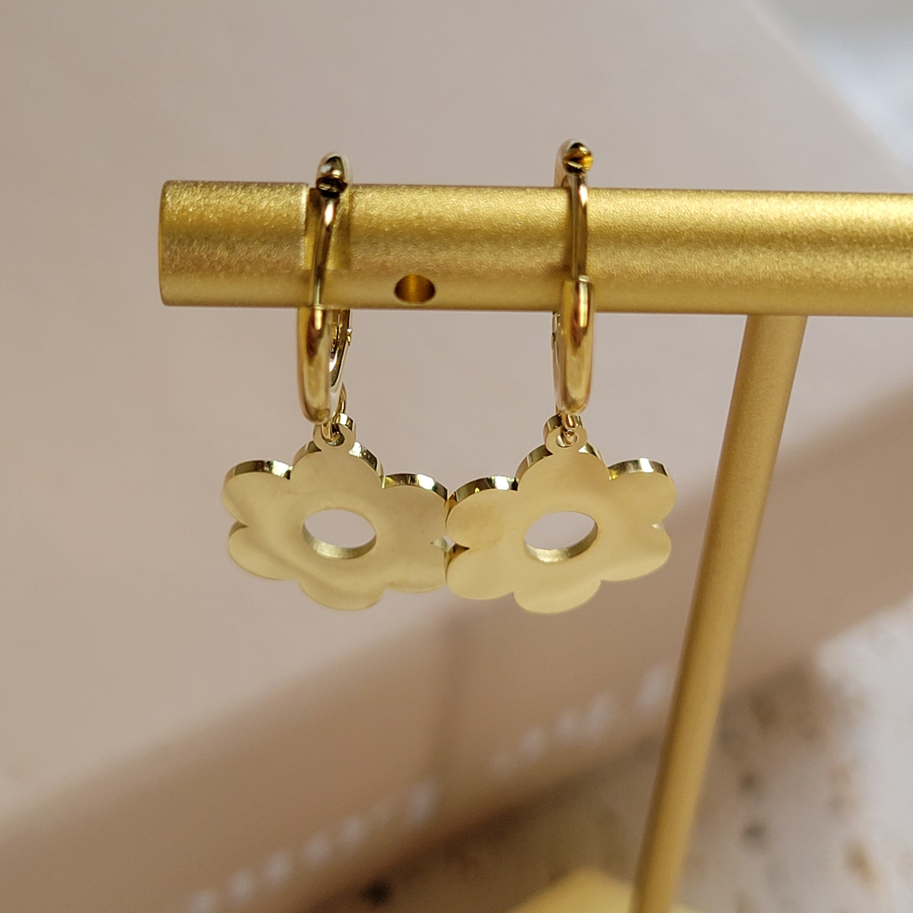 ゴールドのミニフープに揺れる、小ぶりなフラワーモチーフ。